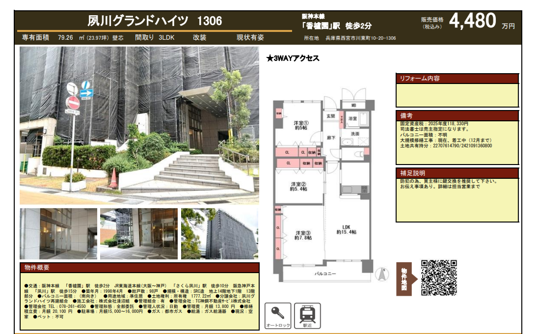夙川グランドハイツ1306号室 4,480万円 西宮市川東町