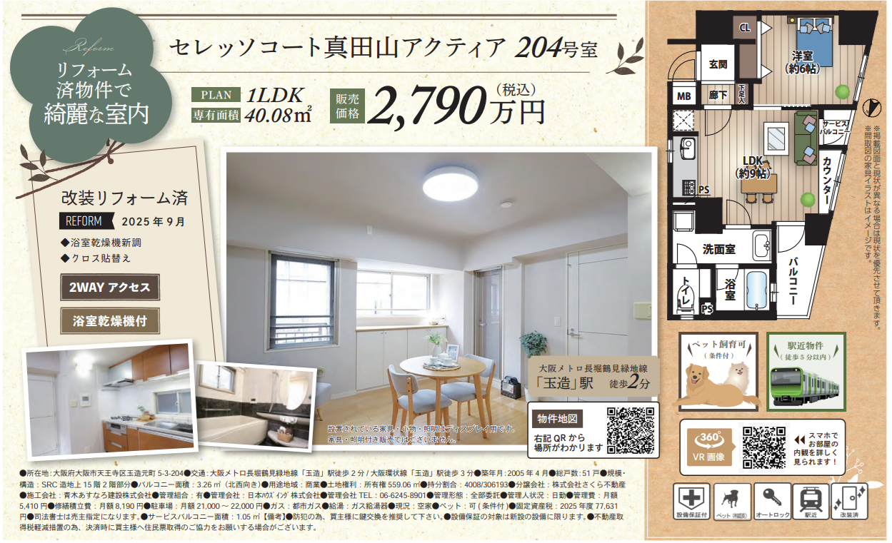 セレッソコート真田山アクティア204号室 2,790万円 天王寺区玉造元町